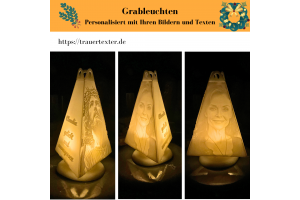 Individuell gestaltete Trauerleuchte in Pyramidenform, personalisiert mit Bildern und Texten. Für Innen und Außen geeignet, bietet eine dauerhafte, umweltfreundliche Erinnerung an Verstorbene. Symbolisiert Liebe und Erinnerung.